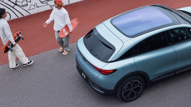 Personas caminando al lado de auto 100% eléctrico smart #3 estacionado en banqueta.